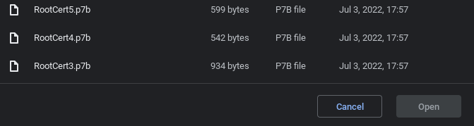 Step 8: Select RootCert6.p7b, then click OPEN NOTE: Install the files in this order: RootCert5.p7b, RootCert4.p7b, RootCert3.p7b, AllCerts.p7b, or now each of the remaining certificates by selecting each and clicking OPEN